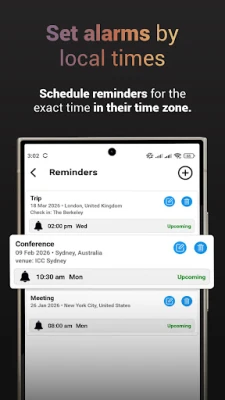 Never miss a meeting or flight. Set detailed reminders with titles and notes and schedule alarms based on the local time and date of any specific time zone - perfect for global travel.