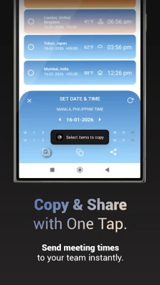 - Quick Convert: Select any city from your list to convert time instantly, then copy or share the result with one tap.