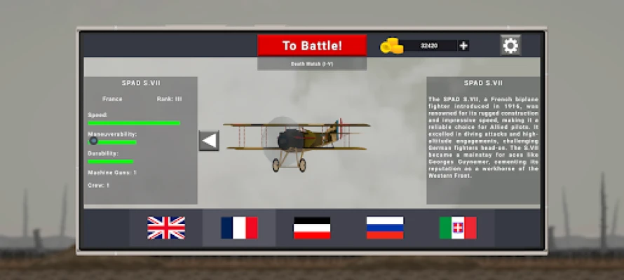✈️ 5 nations available: Great Britain, France, Germany, Russia and Italy. Choose your nation and fly for your country in the sky battle!