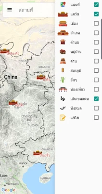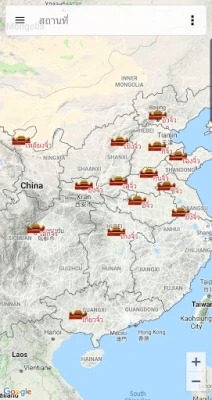 - แสดงข้อมูลเมืองต่างๆ ชื่อไทย-อังกฤษ และตำแหน่งบนแผนที่ปัจจุบัน รวมถึงสถานที่ท่องเที่ยวตามรอยสามก๊กในประเทศจีน