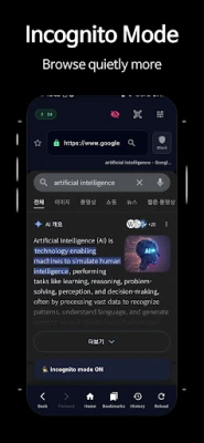 • Privacy-focused browsing with optional Incognito Mode (no history or URL storage)