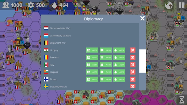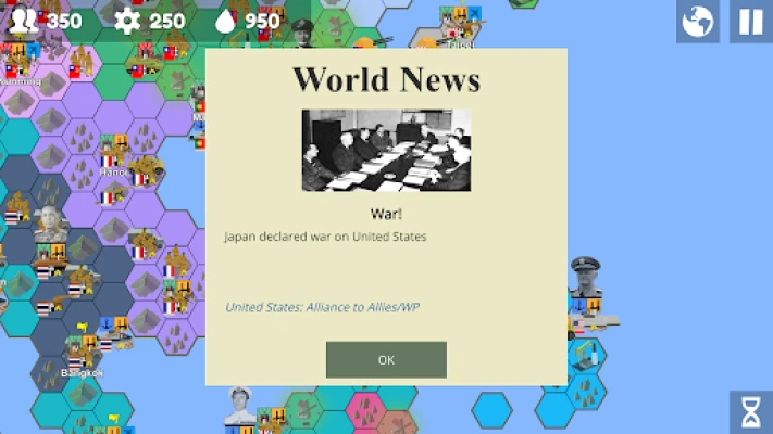 From custom events to war declarations, this recent addition allows dynamic games of multiple alliances and betrayals; custom events can also be made to reflect historical events with different types of consequences (changes to resources, alliances, unit experience). Aid can also be given to allies like Lend Lease in the real WW2.