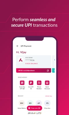 Apart from an interactive dashboard you also set-up a 6 digit MPIN when using open by Axis Bank. This is a cross platform security code that can help you validate fund transfers from your savings account and transactions on your App, as well as log in to internet banking and authenticate Debit/Credit Card payments. The Bhim Unified Payment Interface (UPI) is also enabled on Axis Bank, letting you make UPI payments, Add Payees, Scan & Pay instantly as well as Make Your Own UPI QR Code. UPI ID is a unique ID that is used to make UPI payments in place of bank account details. UPI PIN is a 4- or 6-digit number which needs to be set by you while creating your UPI ID. Please don’t share your UPI PIN. Additionally, you can also find a record of transactions made for your ready reference via: