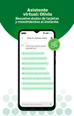 Con Olivia, tu asistente virtual con inteligencia artificial, podrás resolver tus dudas al instante: consultar movimientos, conocer información sobre productos financieros, levantar aclaraciones o revisar el motivo de rechazo de tu tarjeta Azteca.