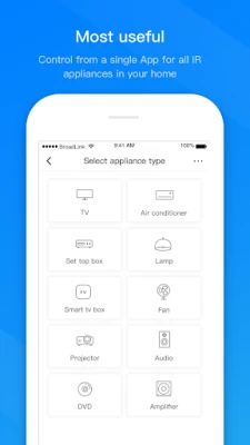 Now you can control from a single App for all IR appliances in your home: TV, air conditioner, set top box, media box, audio, amplifier, DVD/BD player, fan, lamp, water heater, air purifier, vacuum robot, humidifier....It perfectly supports all smartphones with IR port from Samsung, LG, Xiaomi, Huawei, HTC, etc.