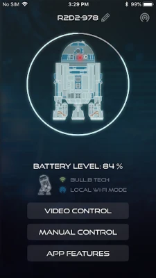 - When Video Control is on, your smartphone screen displays the view from R2-D2's camera, which will change as you drive him around or turn his head. A set of remote controls are superimposed at the bottom. You can capture still pictures or video from his point of view, storing the images in a Gallery within the app or copying them to the library on your phone. You also have a scrollable menu of automatic routines, which include being able to set him exploring his surroundings in an autonomous Patrol mode, turning on his lights and sounds, ejecting a lightsaber, and displaying video clips from his projector.