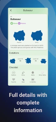 This app is designed to help you track your dex across all games . - Track your regular dex, living dex, and shiny dex - Check images, types, where to find and moves - See all the evolutions and alternate forms - Track both the regular dex and expansions