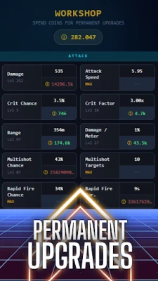 ⚡ Deep Upgrade System: Advanced Workshop Use your earned coins to buy permanent upgrades for Damage, Attack Speed, Range, Critical Chance, and more. This SIMULATION system allows you to create the perfect "build" and optimize your STRATEGY for continuous progress.