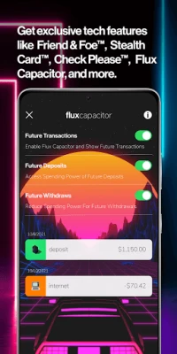 Access the spending power of your paycheck and other deposits up to two days before they even hit.** Get cash at over 55,000 free ATMs*** make instant deposits and mobile check deposits at no fee, and all deposits are FDIC insured up to $250,000†. Use Flux Capacitor to automatically protect yourself against future charges and withdrawals.