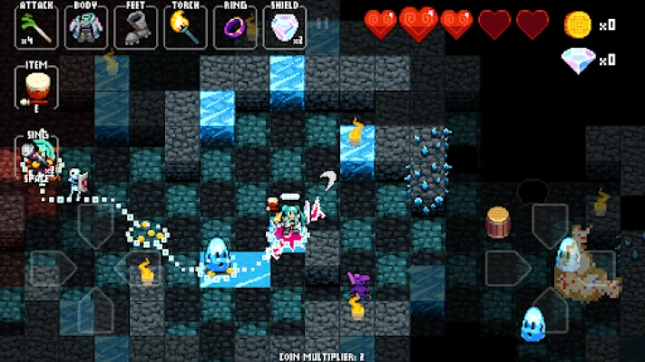 Gather diamonds to unlock permanent upgrades and better equipment to traverse deeper into the NecroDancer’s lair. The deeper you go, the more treacherous enemies you’ll face.