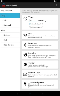• Time delay since "Screen off" or since "Last unlock"