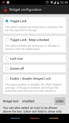 • Widgets & Shortcuts: Toggle Lock, Screen off, Screen off & Lock, Enable / Disable DelayedLock