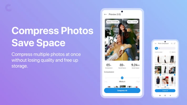 Compress photos in bulk with customizable quality settings — low, medium, or high. Reduce file size, save valuable storage space, and keep your images looking sharp.