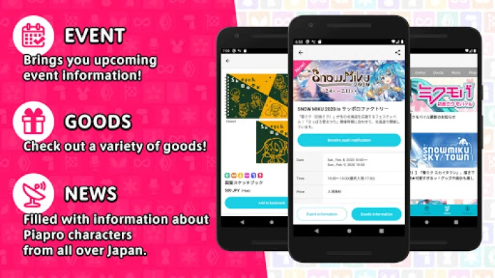With this app, you will be able to check Piapro characters’ information on recent events, goods that are now on sale, etc. By signing in you will be able to receive notifications related to Hatsune Miku and other Piapro characters.