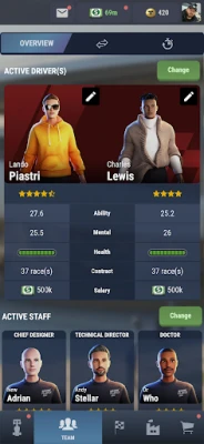 Create your car, hire and manage drivers and staff, and develop your team for long-term success. Build a Formula racing legacy that lasts across seasons.