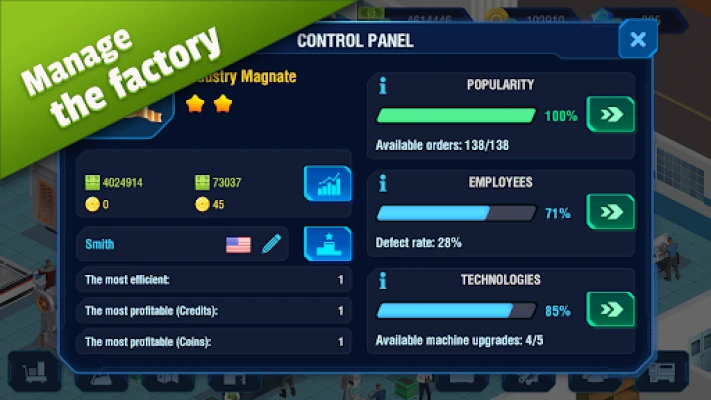 Are you ready to become the head of a major industrial factory? Embark on the journey from a small enterprise to a major international company. Build new workshops, buy equipment, hire employees, and launch production. Make strategic decisions and broaden the horizons of your industrial empire!