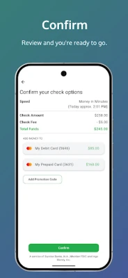 Ingo Money is a service provided by Sunrise Banks, N.A. Member FDIC and Ingo Money, Inc., subject to the Sunrise Banks and Ingo Money Terms and Conditions and Privacy Policy. Approval usually takes 3 to 5 minutes but can take up to one hour. All checks are subject to approval for funding in Ingo Money’s sole discretion. Fees apply for approved Money in Minutes transactions funded to your card or account. Unapproved checks will not be funded to your card or account. Ingo Money reserves the right to recover losses resulting from illegal or fraudulent use of the Ingo Money Service. Your wireless carrier may charge a fee for data usage. Additional transaction fees, costs, terms and conditions may be associated with the funding and use of your card or account. See your Cardholder or Account Agreement for details. Ingo Money service is not available for use within the state of New York.
