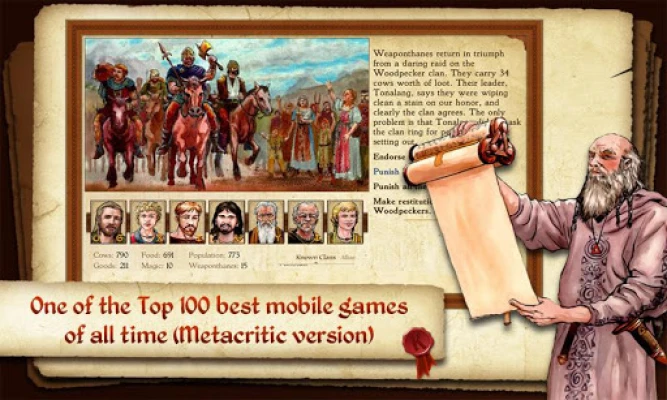 Short episodes and automatic saving mean you can play even when you only have a minute or two. The built-in saga writes down the story for you and advisors with distinctive personalities help you rule your clan.