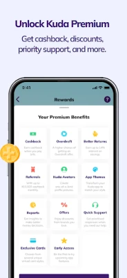 - Earn Kuda Coins to unlock Kuda Premium rewards — cashback, discounts from popular brands, priority support when you need our help, special features like budgeting, spending reports, app themes, and profile picture updates (Nigeria users with Tier 3 accounts only, terms and conditions apply).