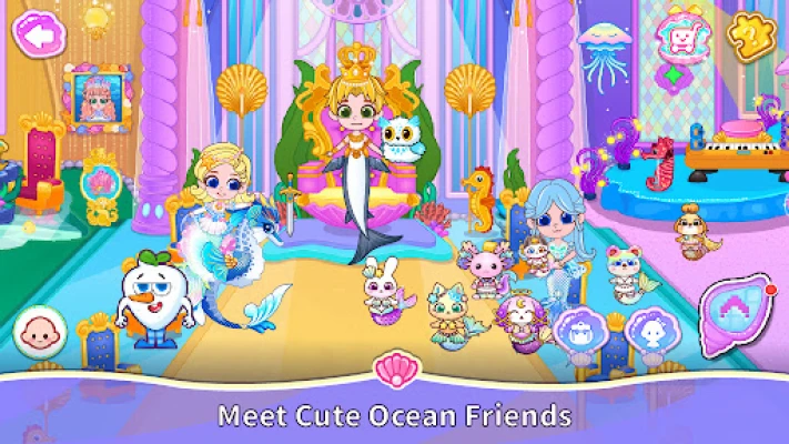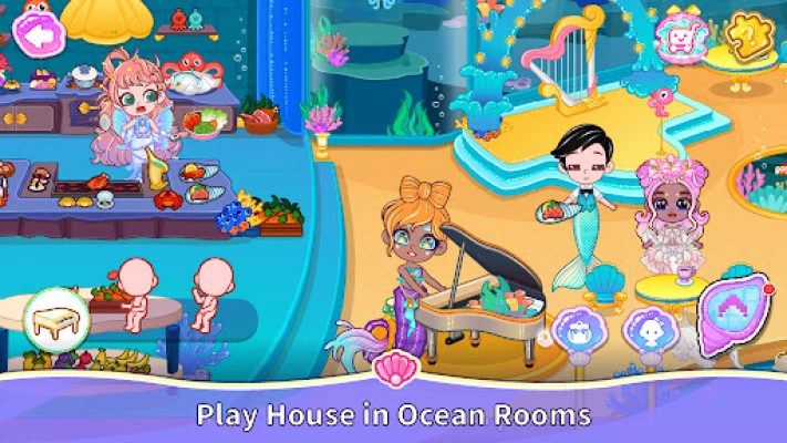 Dive into a beautiful ocean kingdom filled with colorful rooms, interactive items, and fun surprises. Whether you enjoy dress-up, play house activities, storytelling, or exploring new underwater places, this world is yours to create freely.