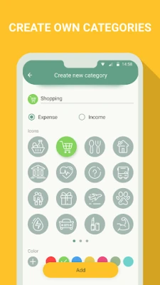 Use ready templates (such expenses as grocery, hobby, utility bills, etc.) or create your own categories, choose any colors and entitle them to adjust the app as you see fit and get the most out of it;