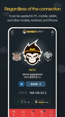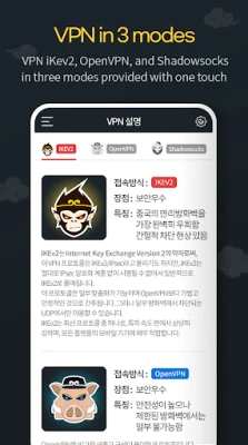 - Monkey VPN has three different ways of connecting: Sonogong, Jeopalgye, and Saojeong.