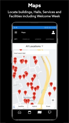 Connect to City, Coach Lane, London and Amsterdam campus maps to find your way around. Tap the ‘i’ icon to see building details, including opening hours.