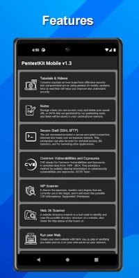 - Browser - WhoIs - Advanced Hackbar - Admin Finder - Google Dork - Web Faker - Web Crawler - Phone Number Crawler - Denial Of Service - Network Scanner (IP and PORT) - Persistent Shells - Proxy - Secure Shell (SSH) - Shell Terminal - CVE Viewer - Web DirScanner - WP Scanner - Run Server