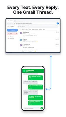 PhoneLeash automatically forwards your text messages to email — and lets you reply right from your inbox. Both sides of every conversation, displayed as clean threads built for Gmail.