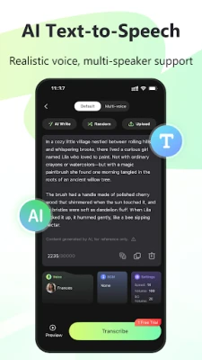 Transform any notes or text into speech with our intelligent AI. Enjoy multi-language translation and narration with creative modes such as “AI Write,” “Random Story,” and “Upload TXT.” Choose from a variety of voices, including popular female, male, and cartoon characters, for natural and human-like speech.