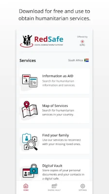 RedSafe is an app provided by the International Committee of the Red Cross (ICRC) that you can download for free and use to obtain humanitarian services. It is governed by ICRC Data Protection rules which protects and secures all personal data given to the ICRC for humanitarian purposes. Data is encrypted and is not shared with external organisations or any other external entities.