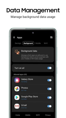 • MANAGE APPS by limiting or restricting their mobile and Wi-Fi data consumption to save money. It's easy, Samsung Max will give you alerts for apps using too much background data.