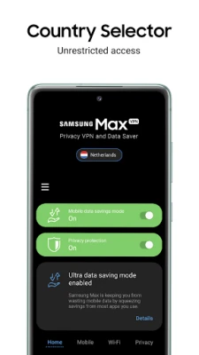 • Samsung Max offers foreground data savings / data compression service and background data management to EXTEND YOUR TIME in all of your apps without your mobile data plan running out as quickly .