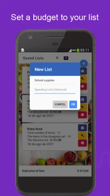 * Click on the plus sign to create a new list. * Enter the items to buy in the yellow text box. * Tap to cross off the item when done.