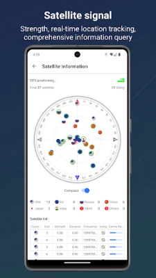 3. Satellite signal: real-time tracking of satellite signals, obtaining satellite information, including nationality name (US GPS, China Beidou, EU Galileo, Russia GLONASS, Japan Quasi-Zenith Satellite System, India IRNSS), number of satellites, real-time satellite location, availability, longitude and latitude, address and other information.