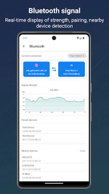 4. Bluetooth signal: real-time detection of Bluetooth signal strength, obtaining information such as the current connected Bluetooth MAC address. Query paired list, scan and discover nearby Bluetooth devices and other functions.