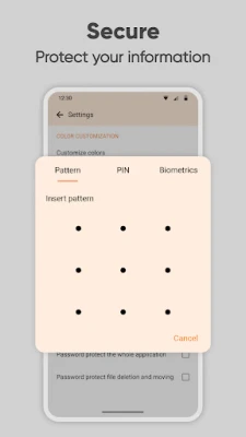 This file organizer is absolutely secure, containing multiple powerful security-related functions, like password protecting hidden items, deleting or opening the whole app. You can choose between using a pattern, pin, or a biometric lock to keep your data private. The fingerprint permission is needed for locking either hidden item visibility, deleting files, or the whole app. Simple File Manager works without internet access, further guaranteeing your ultimate privacy.