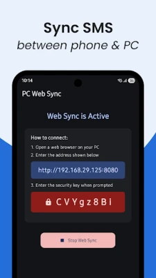 Simply start Web Sync, open the address in your browser, enter the key, and start texting.