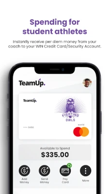 TeamUp is an easy-to-use integrated platform for student athletes. Coaches and athletic directors can use TeamUp to schedule and transfer per diems directly into individual accounts, while students spend safely and build their credit score along the way.