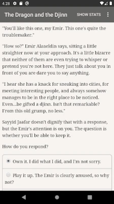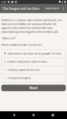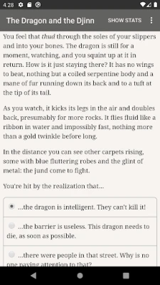 "The Dragon and the Djinn" is a 710,000 word interactive Arab epic fantasy novel by Athar Fikry, where your choices control the story. It's entirely text-based—without graphics or sound effects—and fueled by the vast, unstoppable power of your imagination.