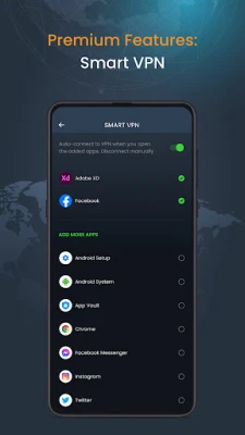 - Smart VPN. The application allows to automatically connect to the VPN proxy when you use an application. After being granted user access and enabling the feature, you choose the apps that when using these applications the system will automatically connect to the VPN. Thus, from the next time you use those apps, they will automatically connect to the VPN.