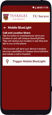 - Mobile Bluelight: Send your location to Tuskegee University security in real-time in case of a crisis