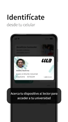 1. Crear y consultar tu Credencial Digital Universitaria, para ser identificado como parte de la comunidad universitaria de manera segura y rápida, dentro y fuera de la ULA. 2. Mantenerte informado sobre las noticias, eventos y anuncios más relevantes de tu universidad. 3. También tendrás la opción de suscribirte a “Beneficios Santander”, para tener acceso a los siguientes servicios: - No financieros: acceso a becas, bolsas de trabajo, programas de emprendimiento, descuentos. - Acceso a productos y servicios financieros en condiciones especiales para Universitarios como tú.
