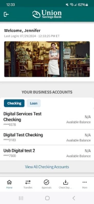 Available to all Union Savings Bank business online banking customers. Union Savings Bank Business Mobile allows you to check balances, make transfers, pay bills, and make deposits. Available features include: