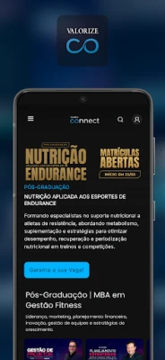 O Valorize Connect é a plataforma ideal para profissionais e estudantes das áreas de fitness, nutrição, educação física e fisioterapia que buscam aprimorar seus conhecimentos e se destacar no mercado. Oferecemos um amplo catálogo de cursos online, eventos exclusivos e aulas práticas e teóricas, tudo desenvolvido por especialistas renomados e atualizado com as últimas tendências do setor.