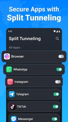 Ability to select specific apps that use VPN, requiring Android 5.0 or higher.