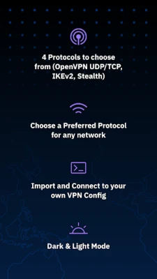 • 6 secure protocols: WireGuard®, OpenVPN (UDP/TCP), IKEv2, Stealth, and Wstunnel. You can adapt for speed, stability, or stealth.