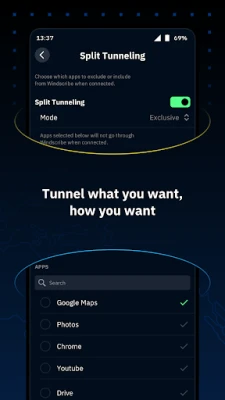 • Split tunnelling to route only the apps you choose through the VPN.