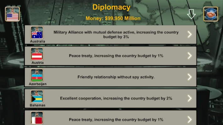 The game offers a wide range of features, including access to global Weapons Suppliers, a Spy Center, a War Room, Diplomats, the United Nations, an Economy system, Technology, and World News Distribution (Economy, Relations, Spy, and War). All this is powered by advanced Artificial Intelligence.
