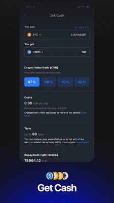 For example: if you use BTC as collateral, and want a Get Cash value of 100 eur (with 100€ equal to 70% of collateral BTC value), then 14% APR is applicable or 2.34% for 61 days , thus, costs would be 2.34 euro, total repayment 102.34 euro in 61 days.